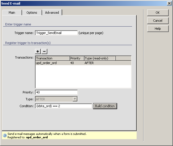 The quantity check and the e-mail sending are implemented using triggers. The order status update is implemented by using an update record transaction. A trigger can only be added to a page that already contains a transaction, so the update transaction will be the first one to implement.