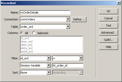To completely remove an order, all records stored in the order_product_opr table which relate to the order deleted at step 3 must be removed. Since the order ID is stored as a foreign key in the table, it can be viewed as a detail table of order_ord. MX Kollection 3 provides a server behavior that allows removing orphaned records (detail records without a master element): the Delete Detail Records trigger.