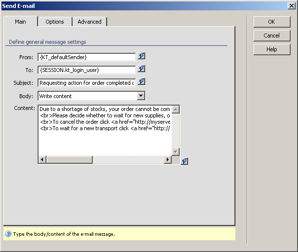 The last step to take in order to complete the page is to add the trigger that sends an e-mail message if not enough products are available. This e-mail message will contain two links: one that allows cancelling the order - by deleting it from the database tables, and one that switches its status to acknowledged.