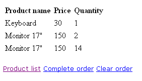 Next add some links that will allow the user navigate your site: one to the view_products page - Product list, one to complete the curernt order - to the complete_order page - and one to clear the current order - to the clear_order page. If you are using the files in the zip package, these links are already created; if not, you have to add them yourself.