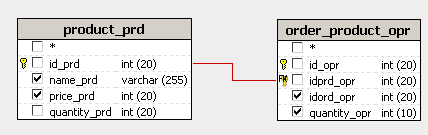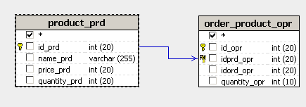 fields. Between the product_prd and the order_product_opr table there is a one-to-many relation.