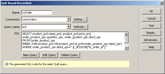 Add a new recordset by clicking on the Plus (+) button of the Bindings tab. Then click on the QuB3 button to open the MX Query Builder user interface. MX Query Builder is a tool that allows creating queries in a visual manner, using only simple operations. For more information regarding MX Query Builder, consult its user manual.