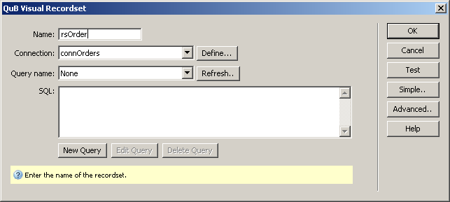 After you have defined the recordset name and database connection, click the New Query button. Enter its name in the dialog box that loads and click OK. The main MX Query Builder user interface will load next. The user interface displays the tables in the left bottom side, and the SQL query, results and columns in the center - bottom part of the screen.