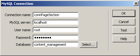 Before starting to work on the site's pages, you must create a Dreamweaver database connection: