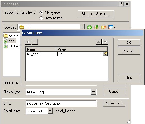 In the Make link dialog, set it to point to the includes/nxt/back.php page.