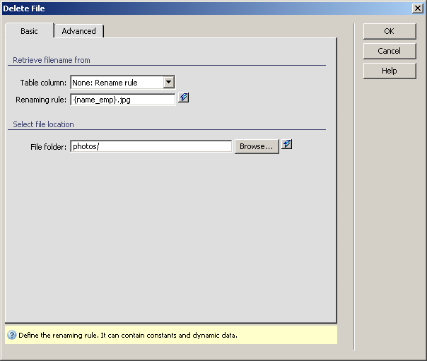 Next you need to add the component which will remove a photo from disk when an employee is removed from the database. This will be implemented with the Delete File server behavior. You can access this server behavior from the Server Behaviors tab > + >MX Kollection > File Upload. Configure the user interface that opens as follows: