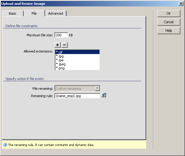 The rename rule is defined in the File tab of the user interface. The rule is the same used in the list creation (employee_name.jpg), with the employee name as dynamic value. To add this dynamic value, click on the blue lightning bolt next to the Renaming rule text field to open the InterAKT Dynamic Data dialog box.