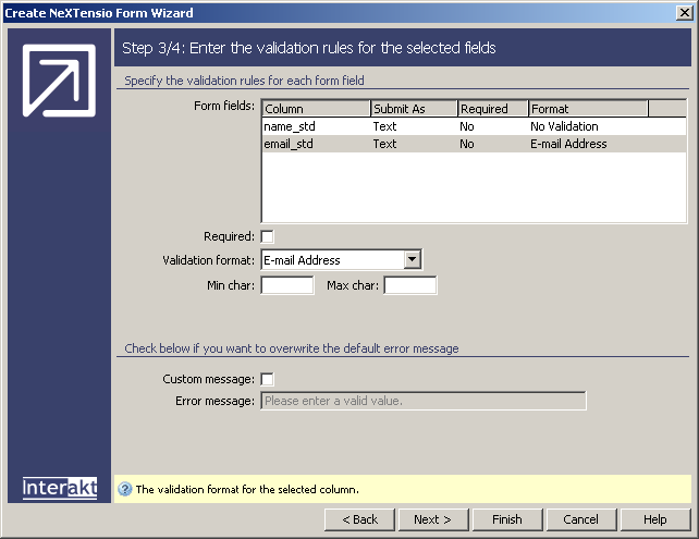 Select the email_std column in the Form fields grid and set its Validation format to E-mail Address.