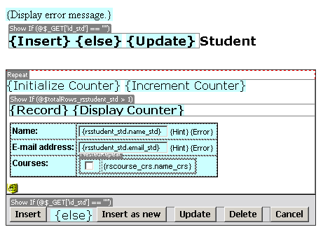 Open the form page in Dreamweaver. This page was created by the wizard applied in the index file.