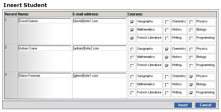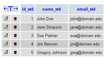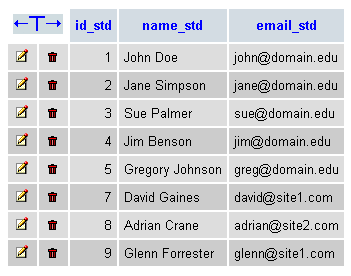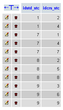 Click the Insert button for the 3 set of records to be inserted (do not forget to type valid e-mail addresses since you chose to use a validation rule for this form field). The insertion operation will affect the student_std table (3 new records) and the student_to_course_stc table (3x3=9 new records). See below how the student_std and student_to_course_stc tables look after the insertion.