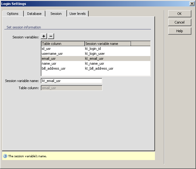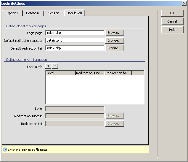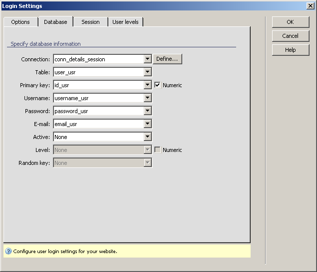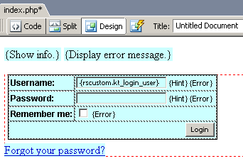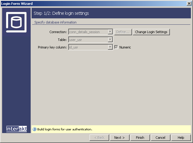 It is time to create the login form now. Start the Login Form Wizard from the MX Kollection tab of the Insert bar and configure it as explained below: