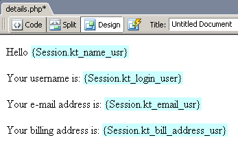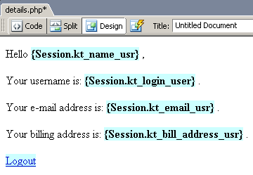 In this tutorial topic you will build the details page. This is the page where the user will be redirected to once he/she successfully logs in onto your site (as set here). From the session variables created upon login, this page will display the private information (full name, site username, e-mail address, billing address) of the currently logged-in user. Users that have not yet logged in must be prevented from accessing this page, as it would display only empty fields (the session variables do not exist).To allow only logged-in users see the page content, apply the Restrict Access To Page server behavior.