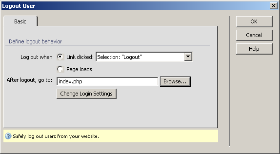 In the After logout, go to text box enter the index page. You can use the Browse button to locate it.