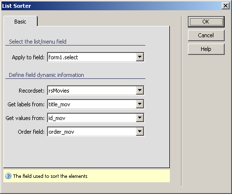 The menu will allow changing the order of elements, after the List Sorter widget is applied. Click on the menu to select it. You can access the List Sorter server behavior from the Server Behaviors tab -> Plus (+) -> MX Kollection -> Form Controls. Configure the user interface as follows: