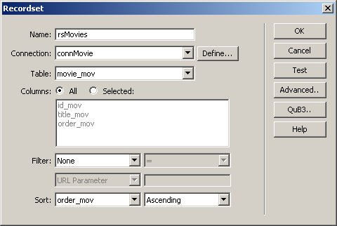 the movie_mov table. To add a new recordset,