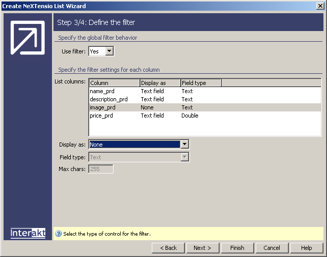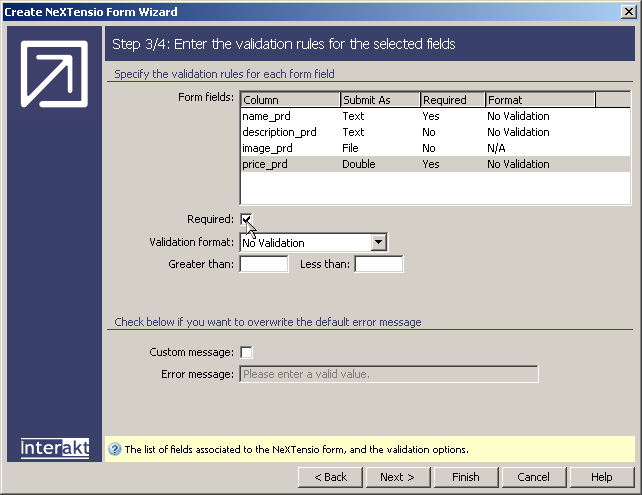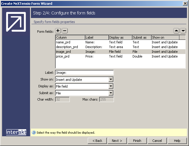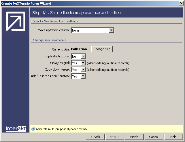 Go to the MX Kollection tab of the Insert bar and click the Create NeXTensio Form Wizard icon. The wizard is divided into four steps which must be configured. Because MX Kollection uses the user interface persistence, part of the field options are already set up.