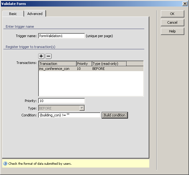 Next you have to configure the form validation to execute only when a conference center has been specified (in the building_con field). To do so, click on the Advanced tab. This is where you can define a condition to start the execution. You can either type the condition directly, or, better yet, use the Condition Builder.