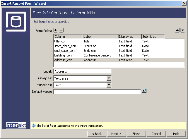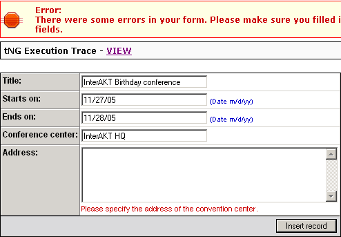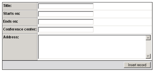 In this topic you will learn how to create the form that allows adding new conference information into the database. The insert operation will be handled with the Insert Record Form Wizard. However, not any kind of data will be allowed into the database. Information that is submitted must obey several rules: