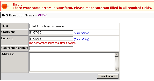Now test the page. Save it and preview it in browser. If you try entering an incorrect end date, the entered error message will be displayed: