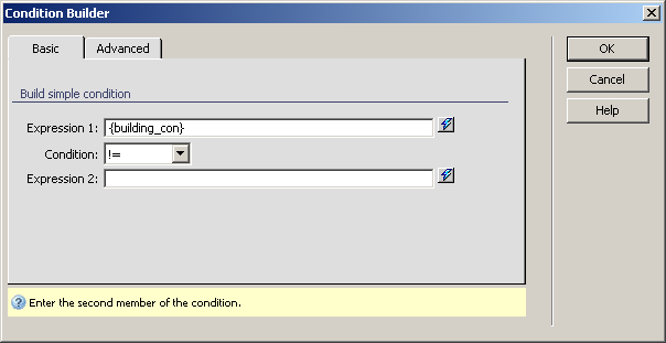 In the Advanced tab click the Build Condition button. This will open a new user interface with three fields: the two expressions and the operator. The two text boxes for expressions have the InterAKT dynamic data icon. Configure this user interface as follows:
