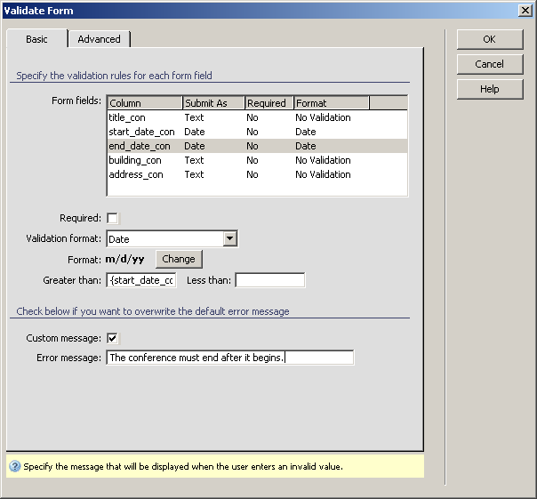 In this section of the tutorial you will learn how to enforce date rules: the start date will be set to be in the future, and the end date will be set to be further into the future than the start date. This is accomplished for the form added with the Insert Record Form Wizard by editing the Validate Form server behavior that is automatically added.