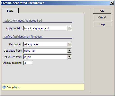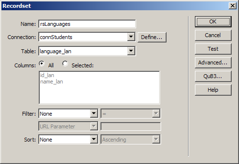 In the Recordset drop-down menu select the rsLanguages recordset created earlier.