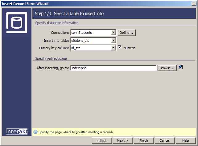 In the Insert into table drop-down menu select the student_std table.