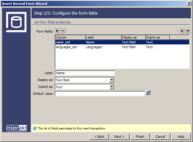 In the second step of the wizard define the columns to insert into and what form elements to display: