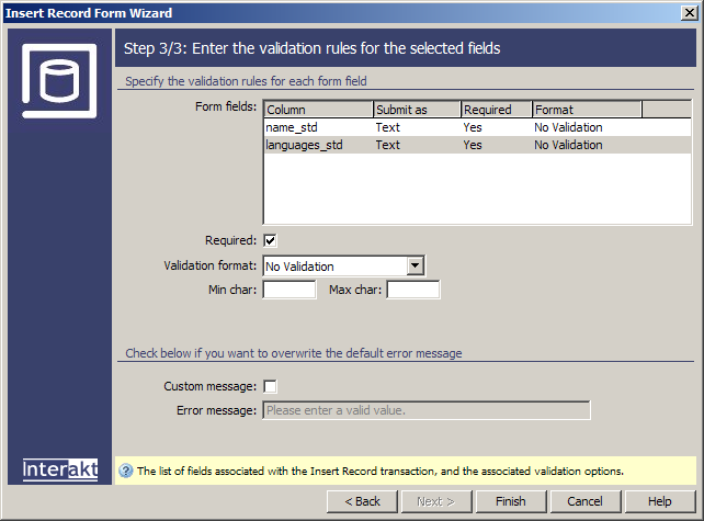 In the last step of the wizard define validation rules for the fields involved in the transaction:
