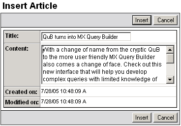 The modified_art date gets a value only when the article is updated for the first time, and not on insert. For this case, the field will be shown on Update only. Select this option from the drop-down menu and set the other options similar to the first case. Additionally, you will have to set the modified_art table column to allow NULL values (as you will not insert a value when the article is created).