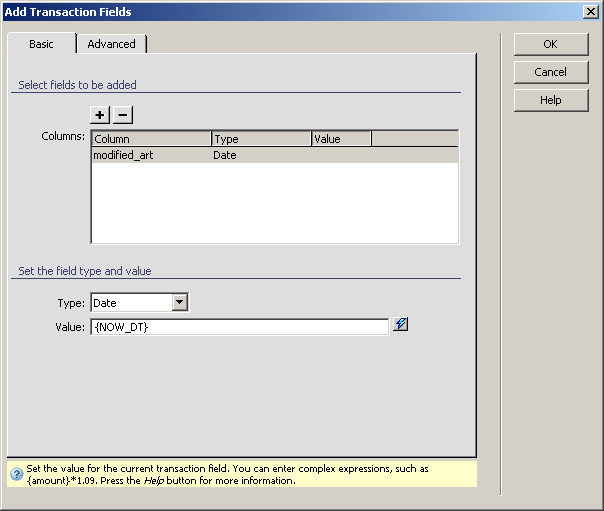 In the Basic tab click on the Plus (+) button to see a list of fields that can be added. From the list, select the modified_art field and click OK.