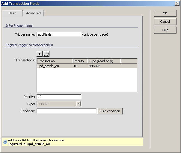 Add the Add Transaction Fields server behavior to the page. You can access it from the Server behaviors tab > + > MX Kollection > Forms > Advanced. The user interface is divided into two tabs: Basic and Advanced. Configure them as follows.